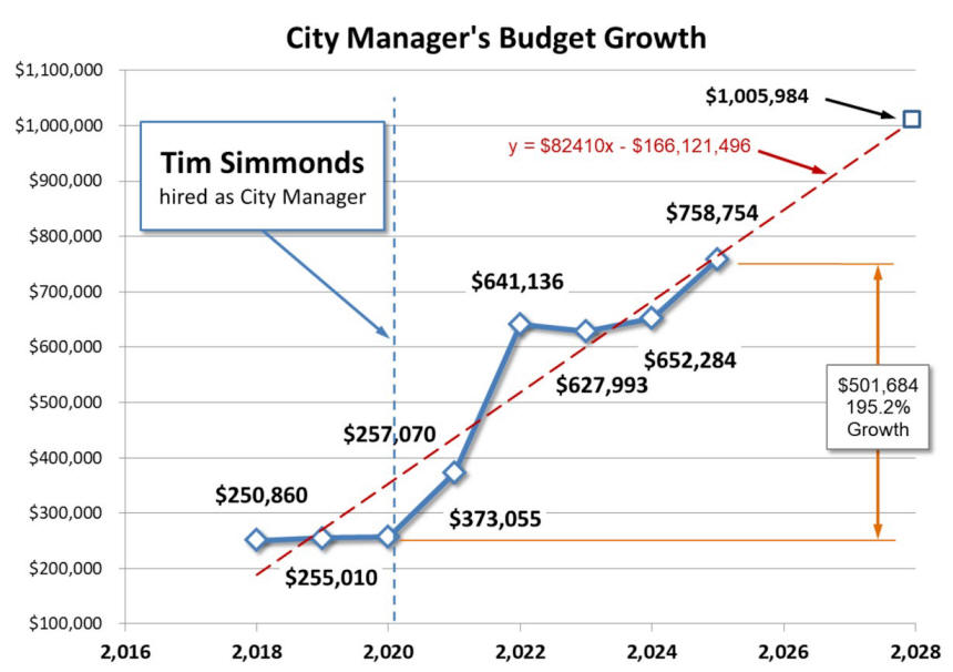 The city manager's office budget has traditionally been less that $280,000. In 2020 a new city manager was hired. In the five successive years Council repeatedly approved annual increases to his budget in the order of 40% per year resulting in the total budget growth of $501,684 or 195%. Take a look at the following graphics that pretty much speak for themselves.