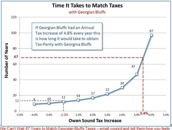 Based on our current disparity, a 3.4% increase in Owen Sound alongside a 4.82% increase in Georgian Bluffs would mean it will take 67 years to reach tax parity. Alternatively, if Owen Sound were to implement a 2% tax reduction in 2024 and sustain that path, we could achieve tax parity with Georgian Bluffs in just 12 years.