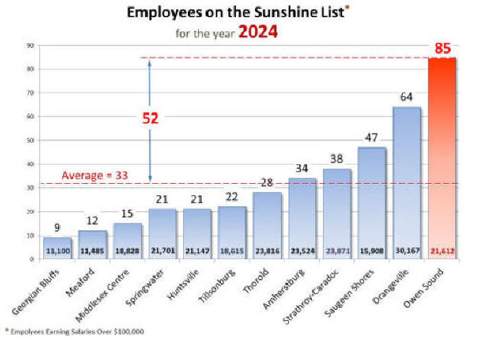 4.   Owen Sound has 9 more people on the Sunshine List at a cost of $823,501 more than Average.