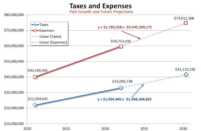 When we project these changes into the future we see that in 2030 expenses will have reached $74.0 million and taxes will have reached $41.1 million. That 's a 24.3% increase in taxes and a 23.9% increase in expenses from 2022.