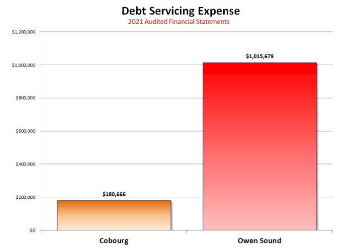 The significance of this is not the debt itself but rather the annual debt servicing or interest charges which adds to the city 's total annual expenses. As we saw in figure 15, Owen Sound is paying over one million dollars annually in interest charges which is significantly higher than other municipalities.